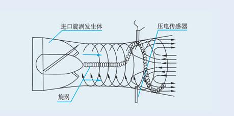 當(dāng)沿著軸向流動(dòng)的流體進(jìn)入流量傳感器入口時(shí),旋渦發(fā)生體強(qiáng)迫流體進(jìn)行旋轉(zhuǎn)運(yùn)動(dòng),于是在旋渦發(fā)生體中心產(chǎn)生旋渦流,旋渦流在文丘利管中旋進(jìn),到達(dá)收縮段突然節(jié)流使旋渦流加速,當(dāng)旋渦流進(jìn)入擴(kuò)散段,因回流作用強(qiáng)迫進(jìn)行旋進(jìn)式二次旋轉(zhuǎn)。此時(shí)旋渦流的旋轉(zhuǎn)頻率與介質(zhì)流速成正比,并為線性。兩個(gè)壓電傳感器檢測的微弱電荷信號經(jīng)前置放大器差動(dòng)放大、濾波、整形后變成兩路頻率與流速成正比的脈沖信號,同時(shí)處理電路對兩路的脈沖信號進(jìn)行相位比較和判別,剔除干擾信號,而對正常的流量信號進(jìn)行計(jì)數(shù)處理。